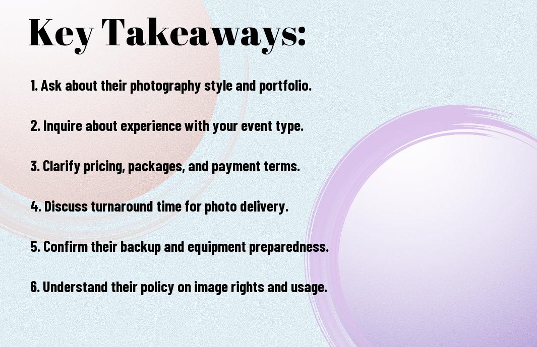 Over the years, selecting the right photographer for your needs has become vital, whether you’re planning a wedding, a portrait session, or a corporate event. To ensure you make the best choice for your vision and budget, it’s important to ask the right questions. This blog post will guide you through the top five questions you should pose to potential photographers, helping you gain clarity on their style, experience, and overall fit for your project. With the right information, you’ll be better prepared to make an informed decision.