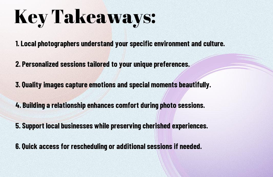 If you choose to work with a local photographer, you gain a distinct advantage in ensuring your memories are captured with a personal touch. Local photographers often build strong community connections, allowing them to create images that resonate with your unique story and environment. Their understanding of local culture and landmarks can add an authentic element to your photographs that distant professionals may overlook.