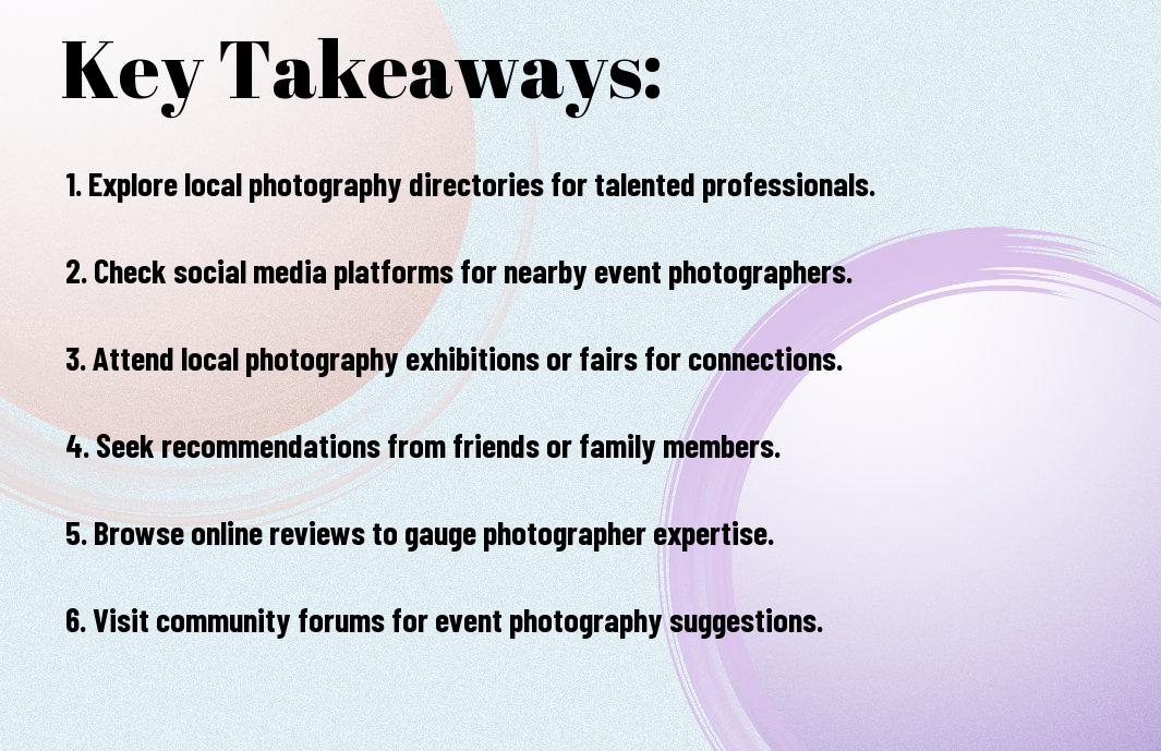 There’s a wealth of talented event photographers waiting to capture your special moments, but finding the right one can be a challenge. In this guide, you will discover effective strategies and resources to unearth exceptional photographers in your area. From online platforms to local recommendations, you’ll learn how to identify the styles and expertise that align with your vision, ensuring your event is documented beautifully. Get ready to elevate your event experience with the perfect photographer!
