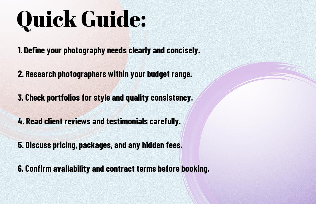 There’s a wealth of options when it comes to hiring a photographer on a budget, but finding the right one can feel overwhelming. In this guide, you’ll discover imperative tips and factors to consider that will help you navigate your choices and ensure you receive quality service without breaking the bank. From assessing portfolios to understanding pricing structures, you’ll be equipped with the knowledge you need to make an informed decision that meets your needs and expectations.