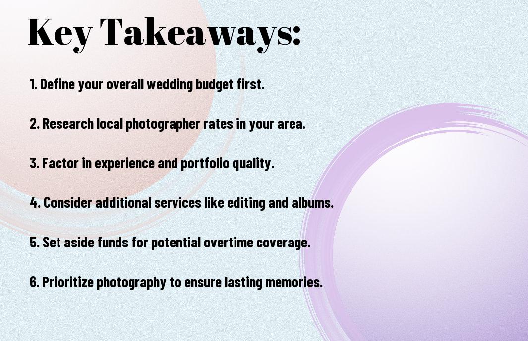 You may be wondering how much of your wedding budget should go toward hiring a local photographer. Understanding the costs involved in capturing your special day is imperative for making informed decisions. From the photographer’s experience and style to the hours of coverage needed, several factors influence pricing. In this post, you will learn how to balance quality and affordability while ensuring your memories are beautifully documented.