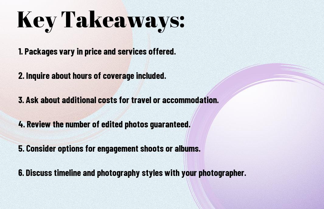 Most couples find themselves overwhelmed when navigating the world of wedding photography packages. With various options and price points available, it’s necessary to understand what each package offers to ensure you capture your special day beautifully. In this post, you’ll learn about the different types of photography packages, what to consider when choosing one, and how to align your needs with your budget. Armed with this knowledge, you can make an informed decision that best suits your wedding vision.
